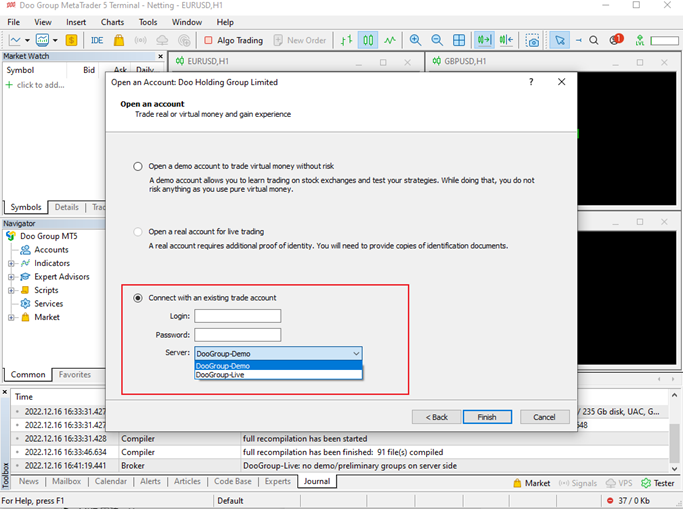 انقر نقرًا مزدوجًا لفتح MT5 ، وحدد [تسجيل الدخول إلى حساب التداول] في شريط القائمة العلوي [ملف] ، ثم ابحث عن خادم التداول المحدد ، وانقر فوق [متابعة]