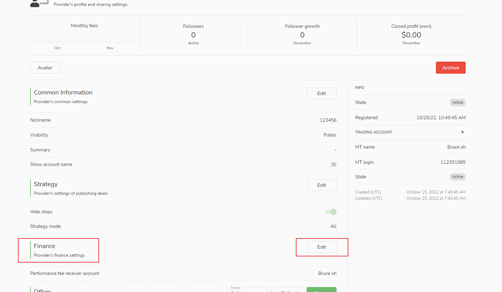 - Under the "My Signal Sources" column, select "Performance Fee Receiver Account Settings" and click the "Edit" button.