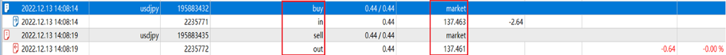 The opening and closing of an order are displayed separately according to in and out, in means opening a position, out means closing a position, and only the out closing order will display the profit and loss amount;