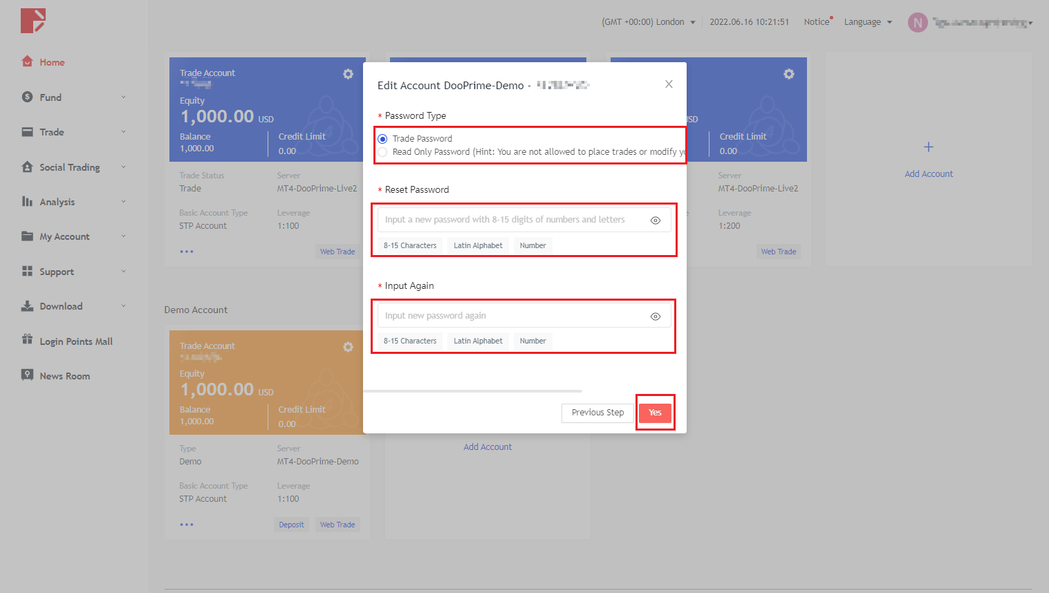 3. Seleccione el tipo de contraseña que necesita restablecer, restablezca una nueva contraseña con una combinación de 8 a 15 dígitos y letras, ingrese la nueva contraseña nuevamente y presione OK. Después de restablecer la contraseña, debe verificar por correo electrónico o teléfono móvil, y luego puede activar la nueva contraseña.