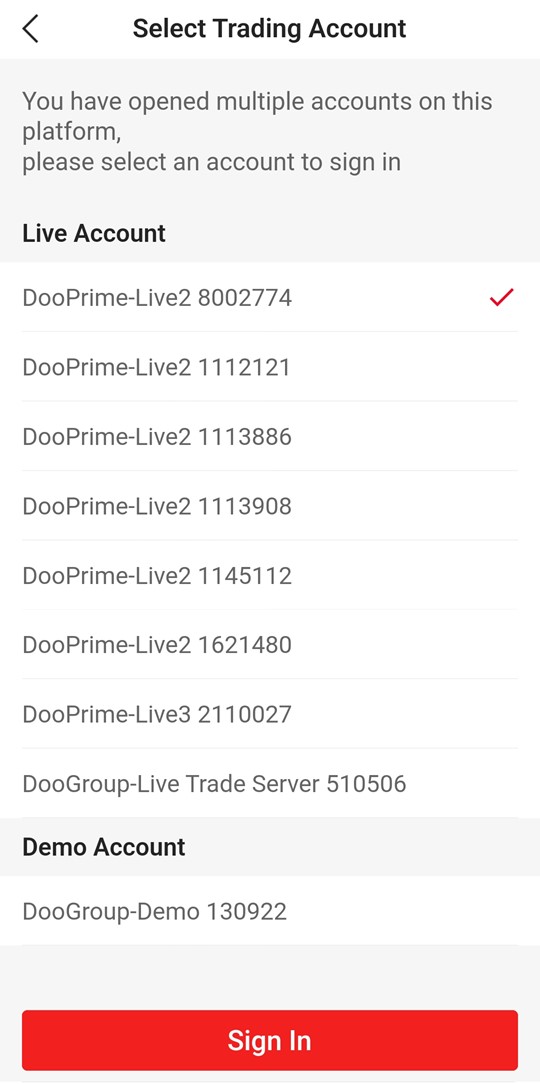 Después de eso, seleccione la cuenta real o la cuenta demo que haya abierto según sus necesidades personales y luego haga clic en "Siguiente" para comenzar a operar con D Prime InTrade.
