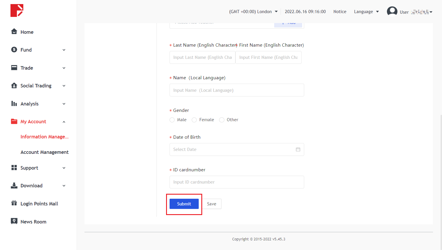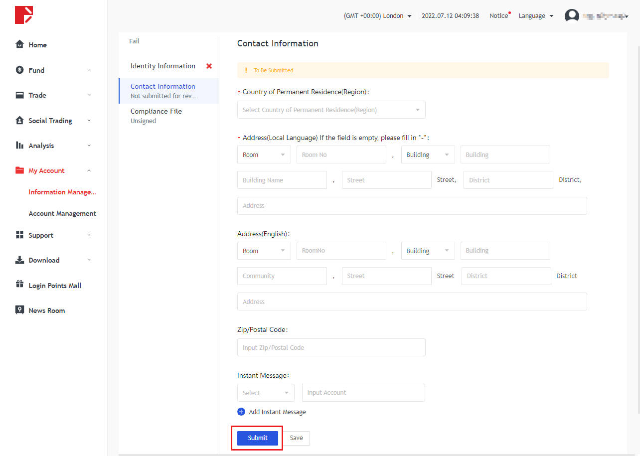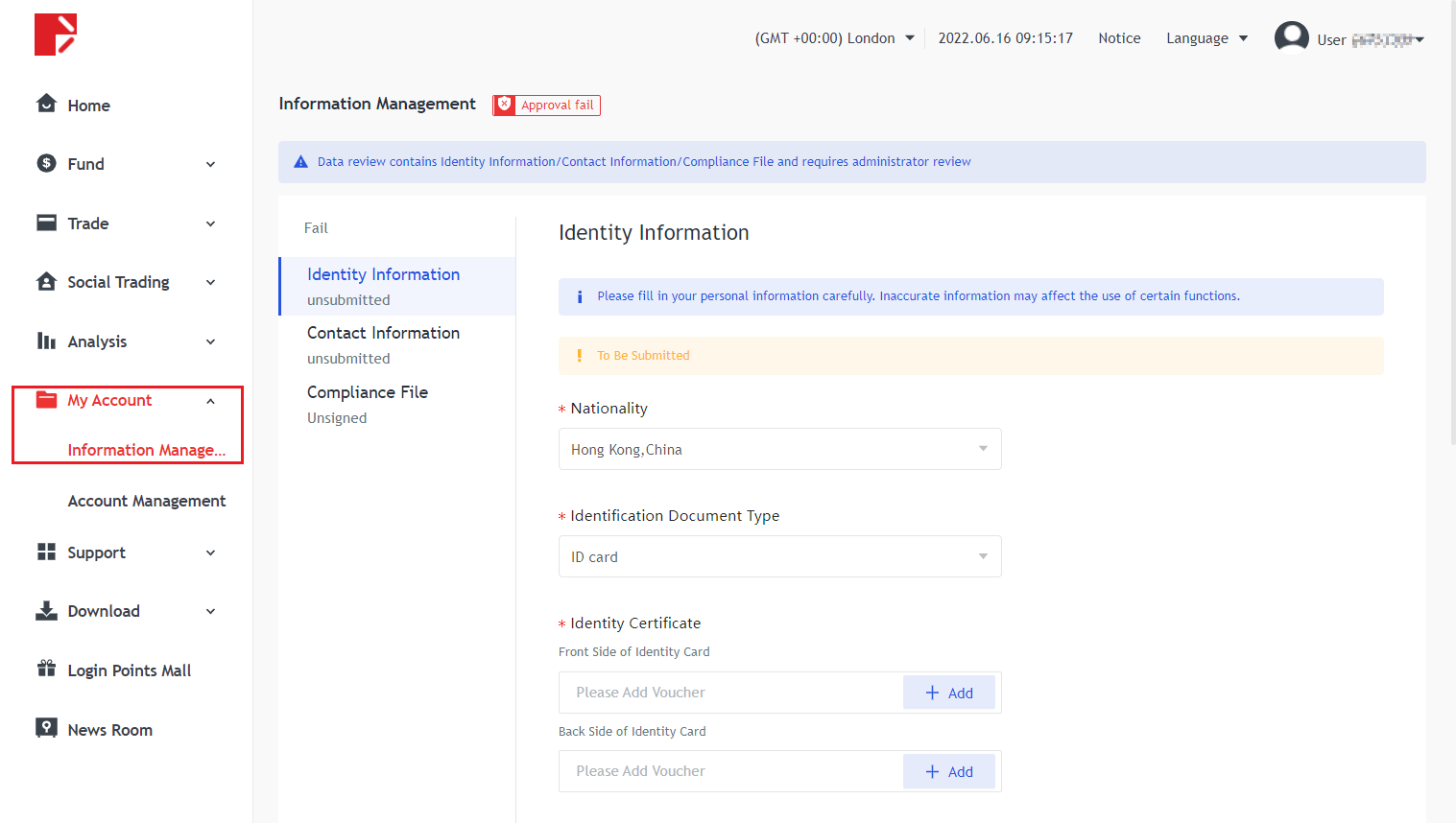 "본인 정보 페이지"로 이동하여 개인 정보를 입력합니다. ID 카드 업로드 후 계좌개설명(병음)만 입력하면 다른 정보 시스템에서 ID 카드 정보가 자동으로 채워지므로 완료 후 "제출"을 클릭하십시오. 인증서의 유효 기간은 6개월 이내여야 합니다.