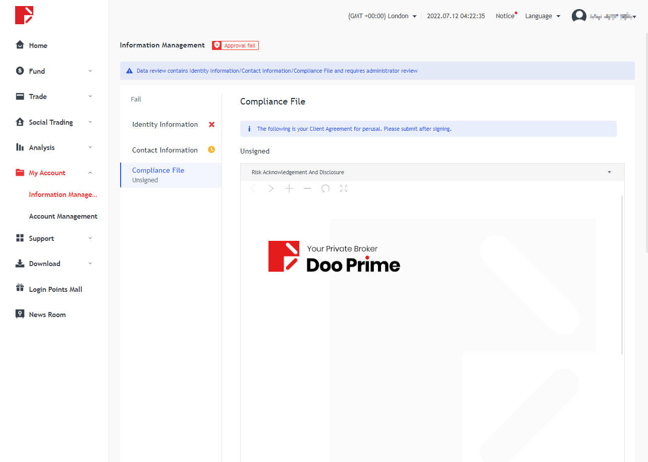 클라이언트 계약 및 위험 승인 및 공개의 이용 약관을 주의 깊게 읽고 기입된 정보가 사실이고 유효한지 확인한 다음 "클라이언트 서명"(병음)에 귀하의 성과 이름을 다시 입력하십시오. 이 법적 구속력이 있는 계약에 서명하는 데 동의한 다음 확인을 클릭합니다.