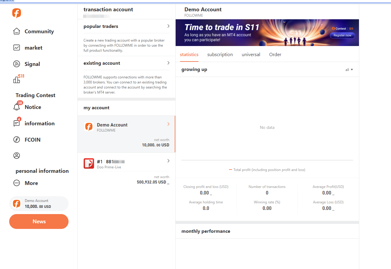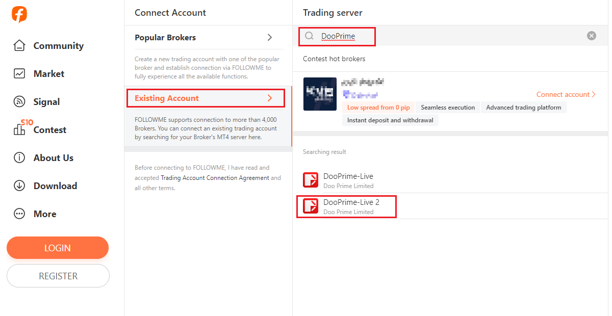 Como conectar uma conta de negociação D Prime via FOLLOWME?