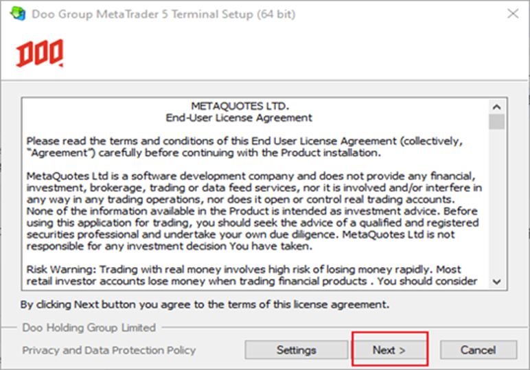 Após a conclusão do download da versão MT5 Windows desktop, clique em [Next] na figura de acordo com o guia de instalação para iniciar a instalação.