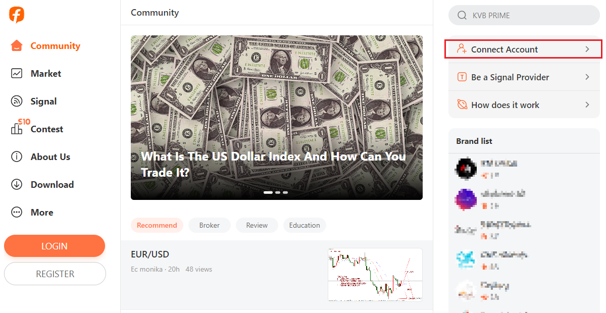 Sau khi khách hàng đăng nhập vào FOLLOWME, hãy nhấp vào "Kết nối tài khoản" ở phía bên phải trang chủ và tìm D Prime trên trang Kết nối tài khoản giao dịch.