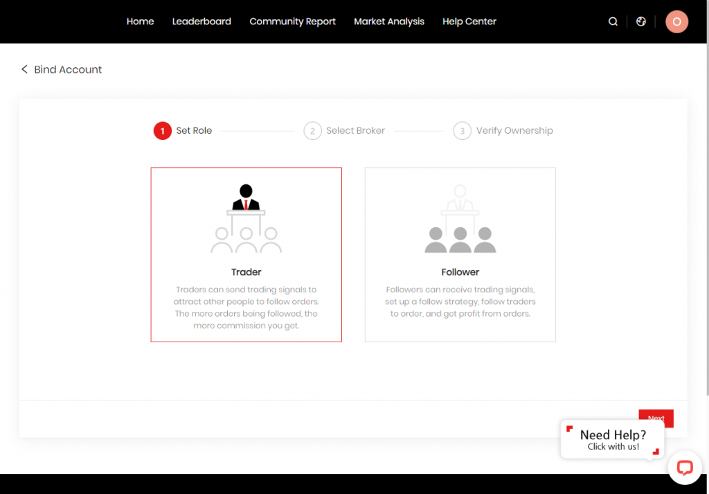 Đăng nhập vào Trung tâm người dùng Doo Prime của bạn, nhấp vào "Giao dịch cộng đồng" ở phía bên trái của trang chủ, nhấp vào "Quản lý tài khoản ngoại hạng", nhấp vào Thêm tài khoản ở phía bên phải của trang, chọn vai trò "Nhà giao dịch" hoặc "Người theo dõi" , và cuối cùng ràng buộc tài khoản là Can.