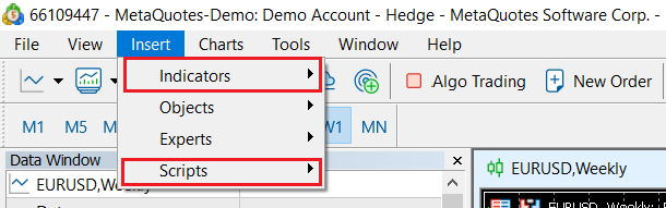 MT5 đi kèm với 38 chỉ báo kỹ thuật đã được viết sẵn và các nhà giao dịch có thể thiết lập chúng một cách độc lập và sử dụng chúng bất kỳ lúc nào; nhấp vào [Chèn] trong thanh menu và trong tùy chọn [Chèn], hãy chọn [Chỉ báo] hoặc [Tập lệnh] và sau đó Chỉ cần nhấp vào Thêm.