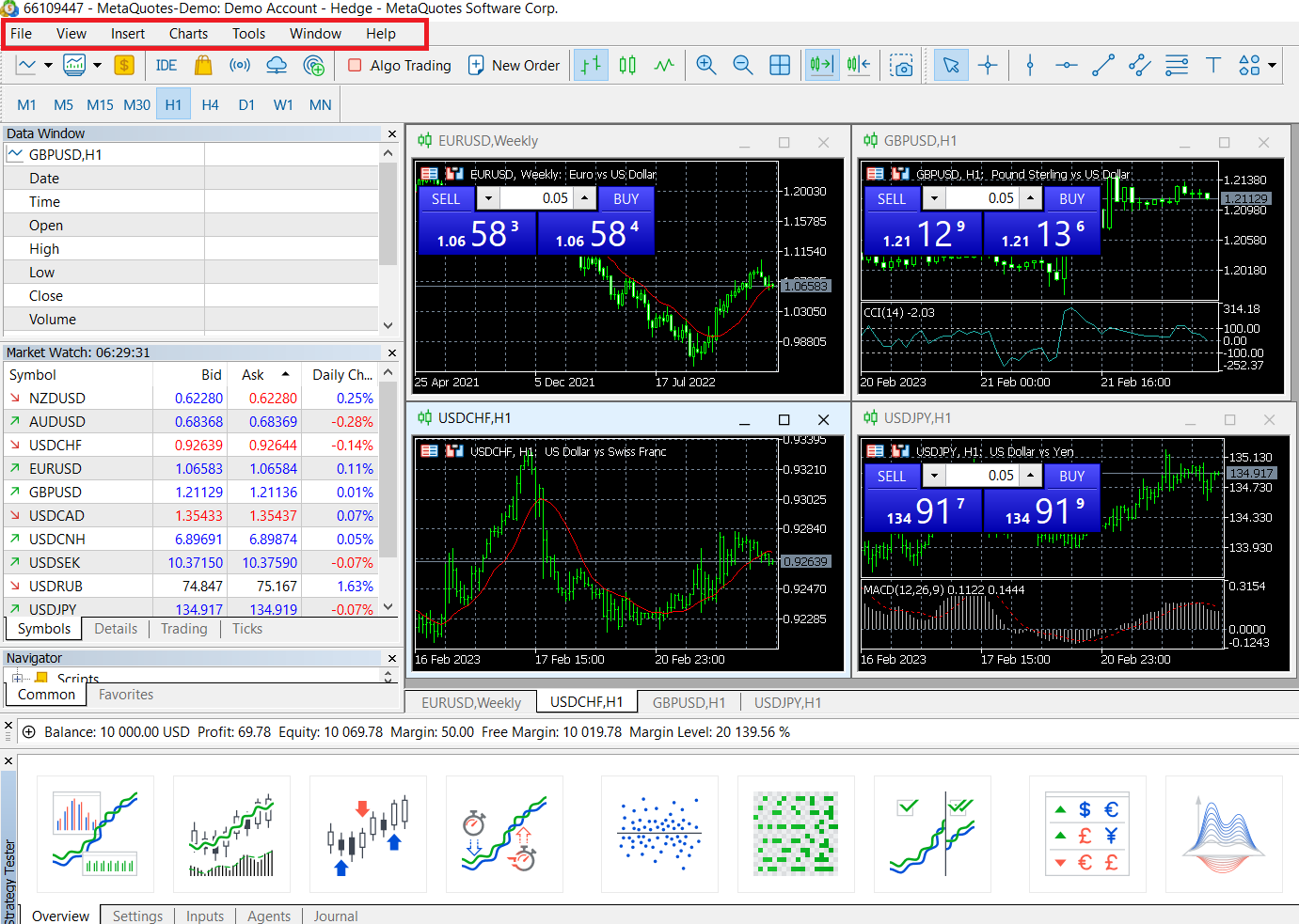 Menu chính bao gồm hầu hết các chức năng trong MT5, giúp người dùng thực hiện các thao tác biểu đồ, phân tích công cụ và cài đặt nền tảng, v.v. Menu chính bao gồm các chức năng chính của [Tệp], [Xem], [Chèn], [Công cụ biểu đồ], [Cửa sổ] và [Trợ giúp].