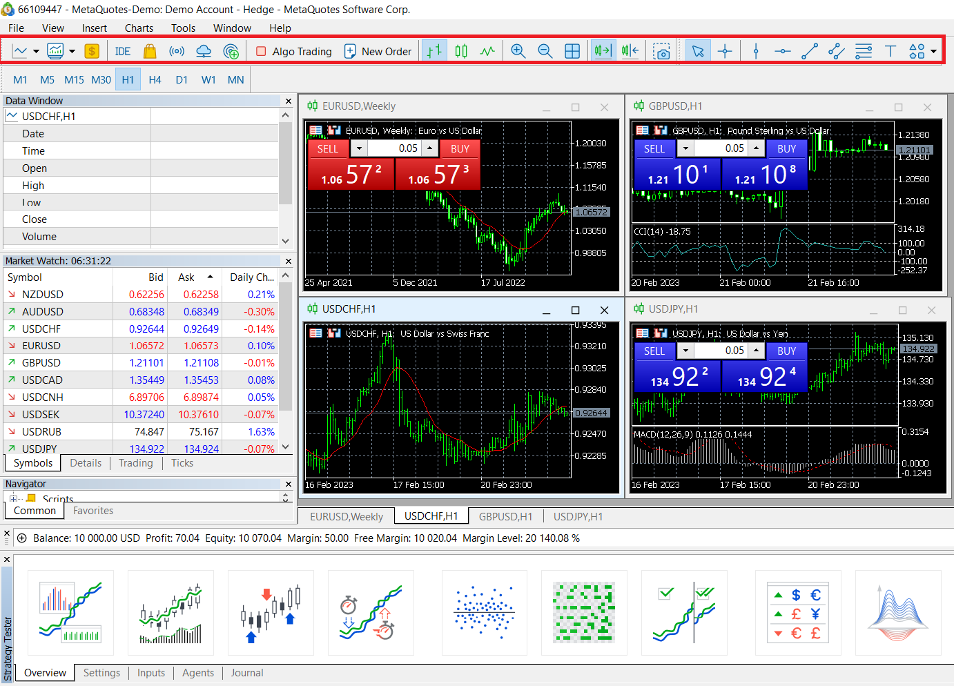 Các chức năng thường dùng hoặc chính trong menu chính được đặt trên thanh công cụ, thuận tiện cho người dùng thao tác nhanh, chẳng hạn như tìm kiếm các ký hiệu giao dịch, đặt lệnh, điều chỉnh các loại biểu đồ và thêm các chỉ báo đồ họa, v.v.